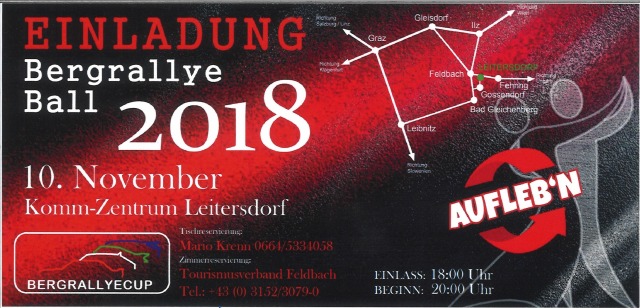Bergrallye-Ball 2018 im KOMM Zentrum Leitersdorf Termin: 10. November 2018 Veranstalter: OK Krenn Tischreservierungen: Mario Krenn +43 664 533 40 58 Zimmerreservierung: Tourismusverband Feldbach +43 (0) 3152 / 3079-0